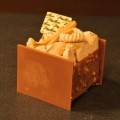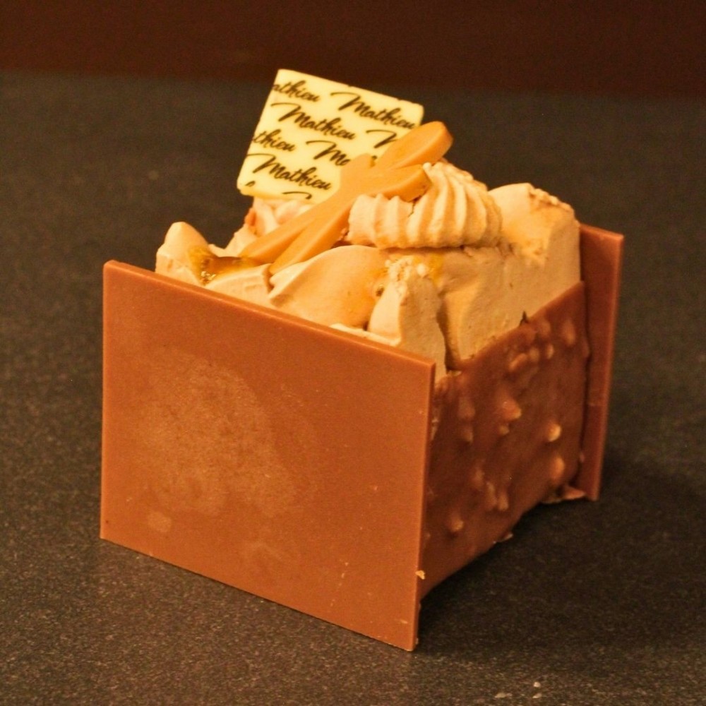 Un croustillant chocolat au lait praliné, une ganache montée chocolat au lait, un confit de mangue et une mousse passion.