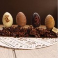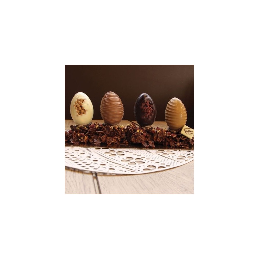 Corn flakes (maïs, sucre, orge et sel, beurre, chocolat noir (extrabitter), chocolat au lait (Tanariva), chocolat blanc (ivoire), noisettes, pistaches, pépites framboises, blé