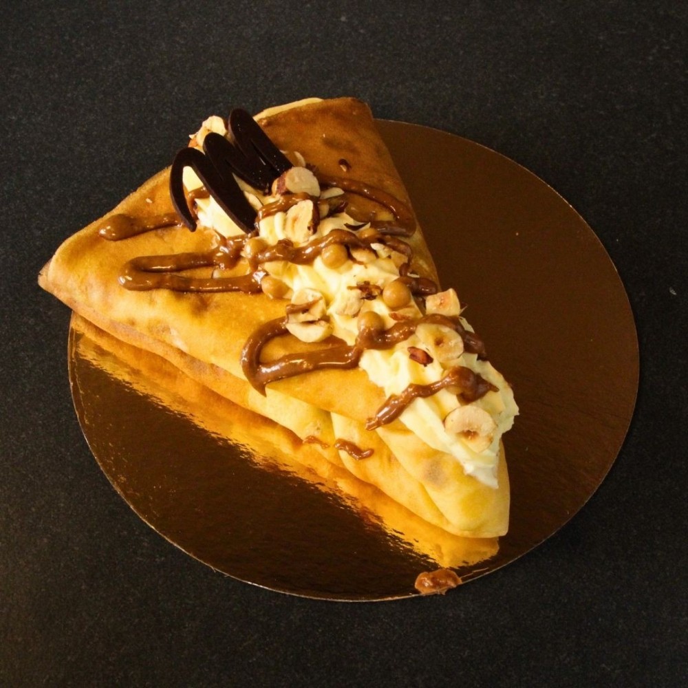 Une crêpe gourmande avec de la crème légère, du praliné maison, des noisettes crousitllantes et des billes de chocolat dulcey.