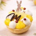 Un demi-oeuf blanc garni d'un croustillant chocolat blanc, d'un crémeux mangue passion, d'une ganache montée chocolat blanc et d'une gelée passion.