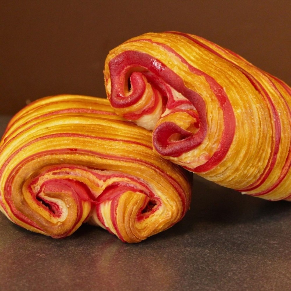 Farine T45, Farine T65, beurre AOP, sucre, poudre de lait, levain, eau, oeufs, miel, crème fraiche épaisse,levure.chocolat gianduja fraises intense