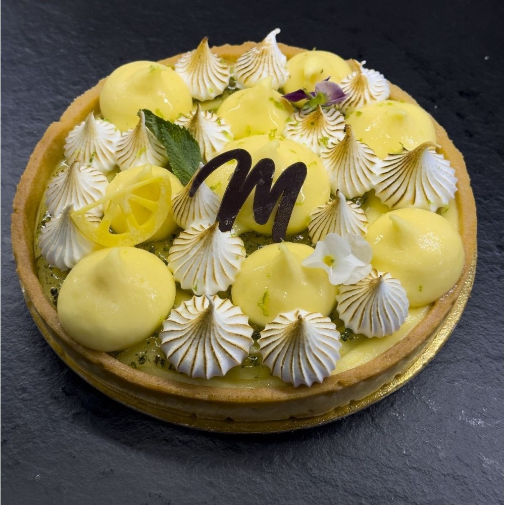Une délicieuse tarte citron meringué avec un crémeux citron, un gel menthe et une meringue italienne.