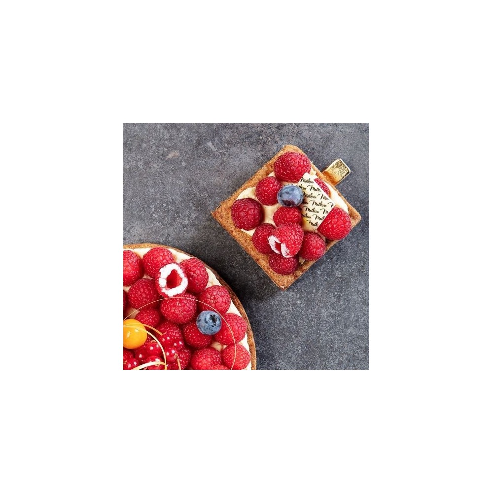 Beurre, sucre semoule, farine T45, jaunes d'oeufs, poudre levante, lait cru, sucre semoule, poudre à crème, jaunes d'oeufs,crème liquide 35%, framboisesPrésence de gélatine bovine